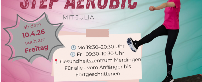 Power, Spaß und Bewegung: Unsere Step-Aerobik-Kurse mit Julia jetzt auch freitags. Ab Freitag dem 10.4.2026 für unsere Mitglieder.